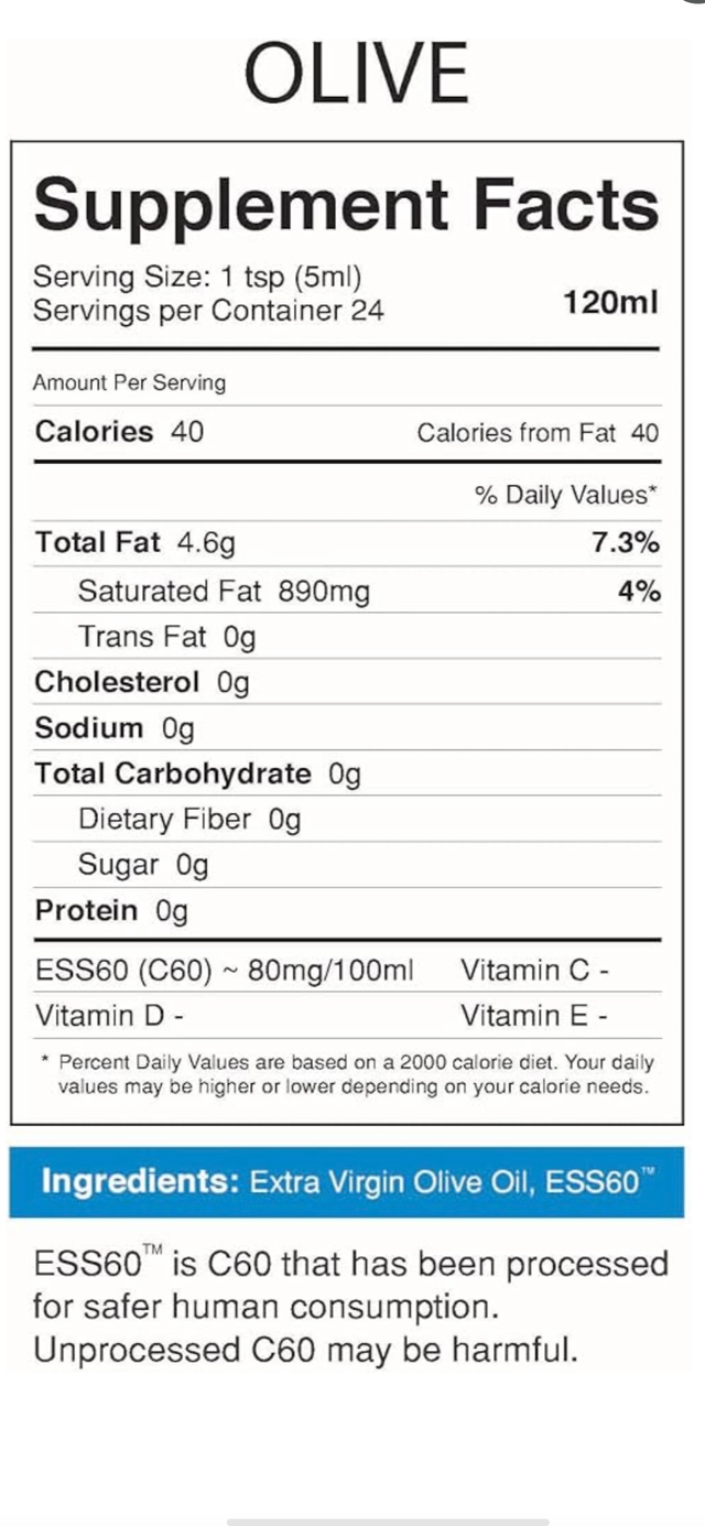 ESS60 (C60 mejorado) es un potente antioxidante molecular disuelto en aceite de oliva orgánico premium. Esta innovadora fórmula combina las propiedades del Carbono 60 purificado con aceite de oliva de alta calidad para maximizar la biodisponibilidad y potenciar sus beneficios antioxidantes.